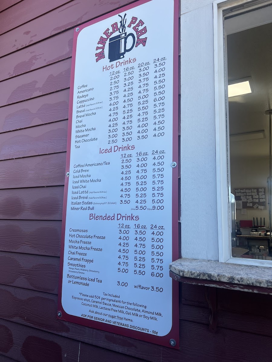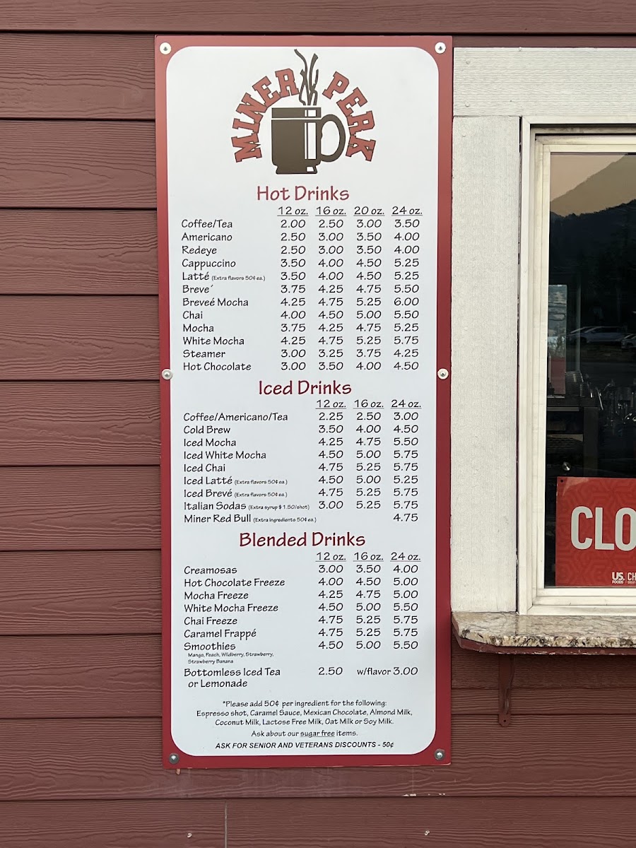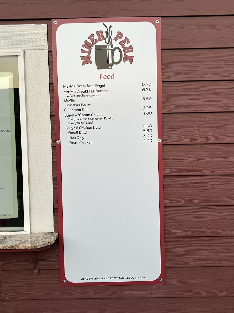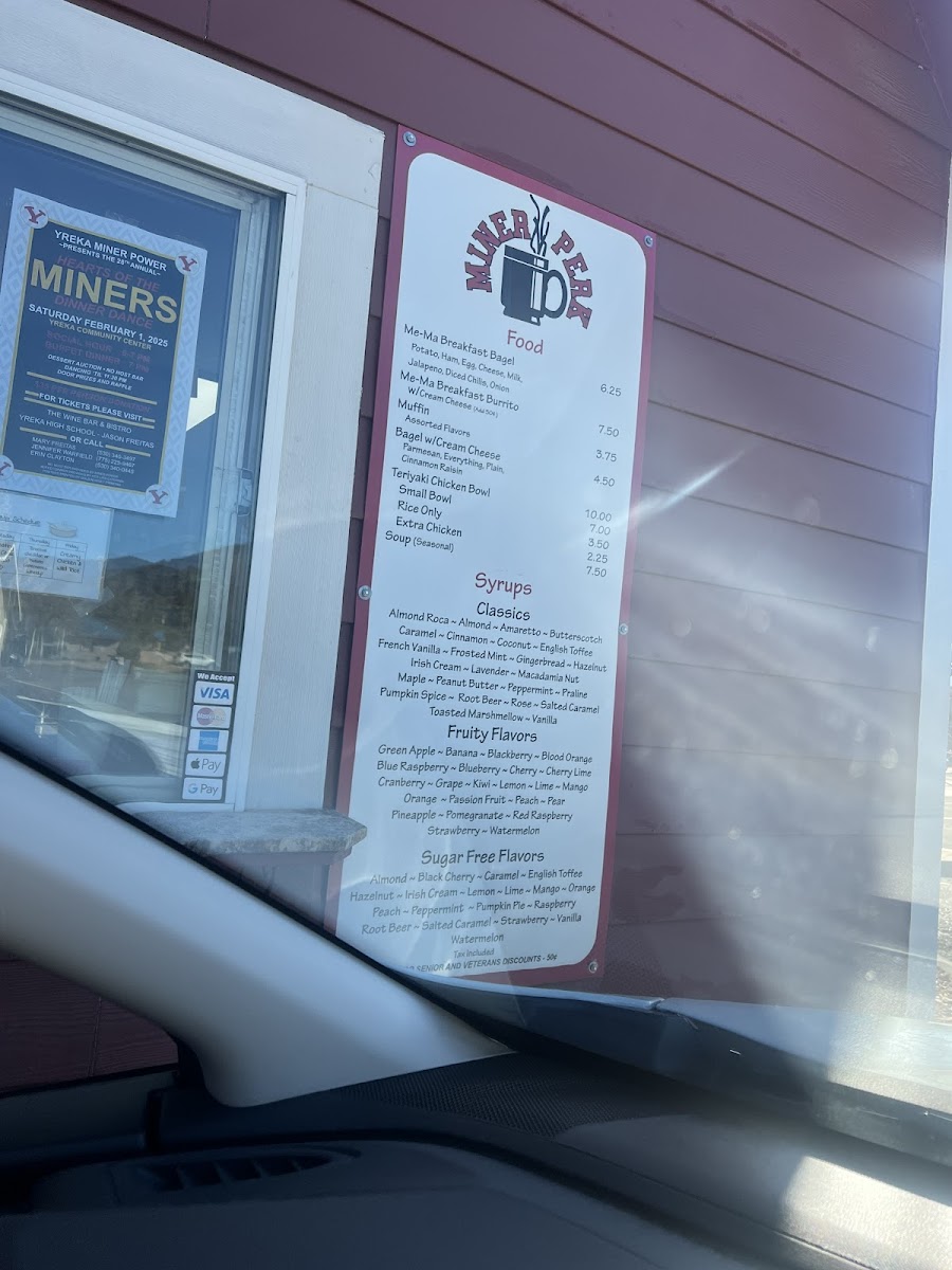 As a final takeaway after exploring the menu at Miner Perk, I’m left with the impression of a cozy, community-focused café that keeps things simple while offering enough variety to satisfy different cravings. The drink selection is especially well-rounded: refreshing Iced Chai, smooth Americano, indulgent Iced White Mocha, playful Italian Sodas, and the energizing Miner Red Bull make the iced lineup appealing, while hot classics like Coffee, Chai, Hot Chocolate, Cappuccino, and Steamer deliver familiar comfort. For those who enjoy richer textures, blended options such as White Mocha Freeze, Caramel Frappé, and Chai Freeze stand out, alongside lighter, refreshing choices like Creamosas and Iced Tea Or Lemonade. The food menu complements the drinks well, leaning into hearty, no-frills café fare with items like the Me-Ma Breakfast Bagel, Bagel With Cream Cheese, and Muffin, all ideal for a quick bite, while the more filling Me-Ma Breakfast Burrito adds substance for a fuller meal. Even simple options like Rice Only reflect a menu designed for everyday comfort rather than complexity. Overall, Miner Perk’s menu doesn’t try to overwhelm; instead, it focuses on familiar flavors, reliable choices, and a balance between drinks and food that makes it an easy, welcoming stop for both locals and travelers passing through Yreka.