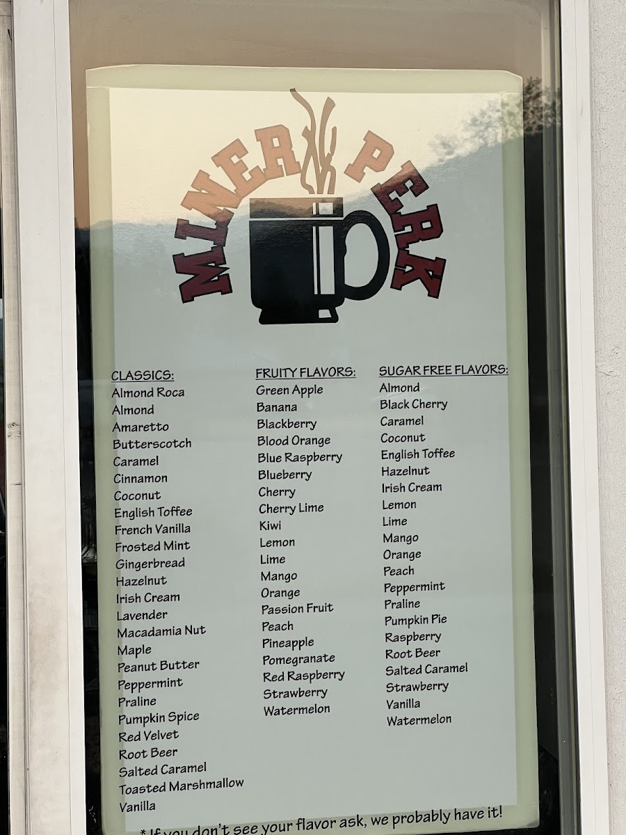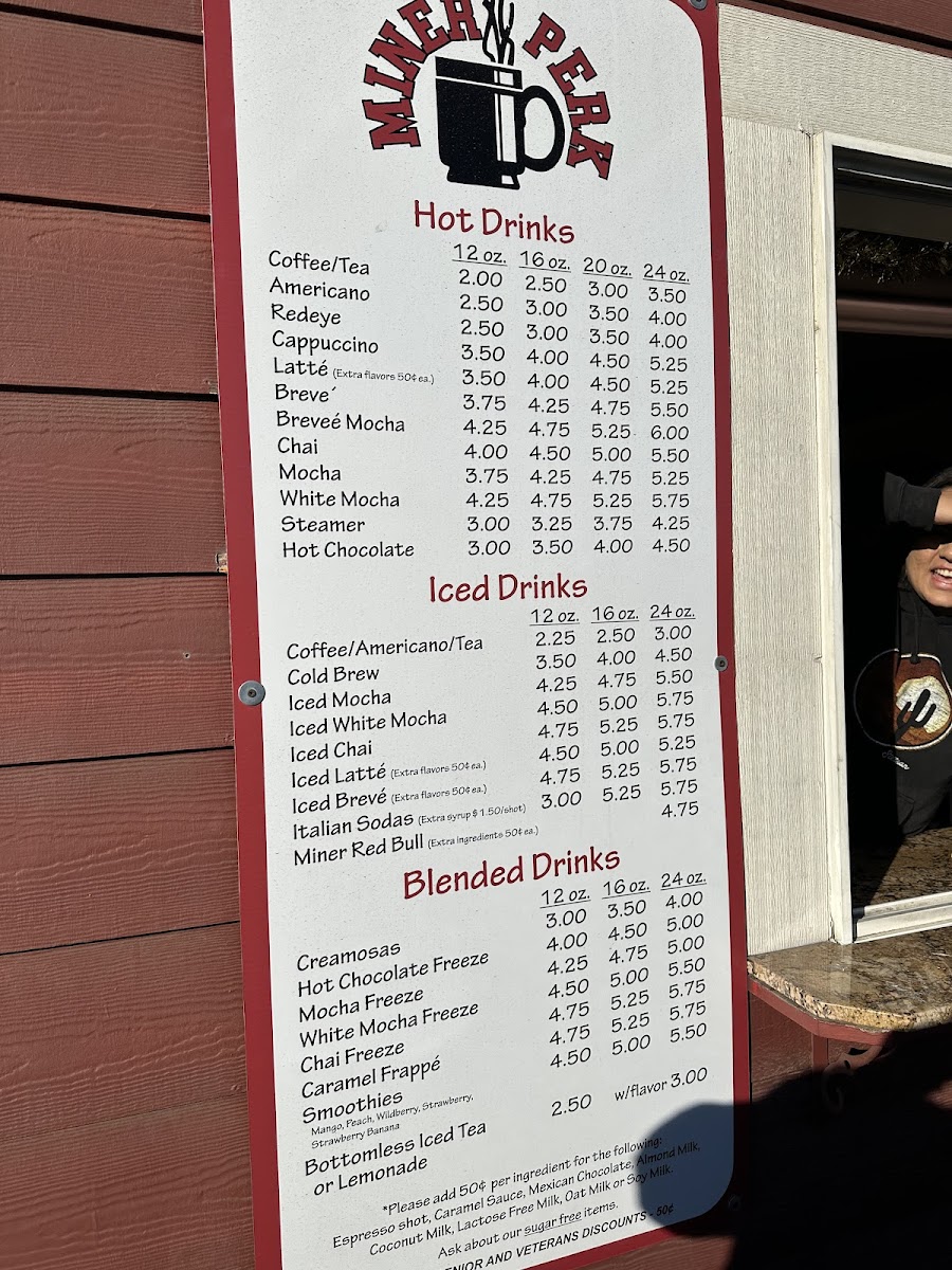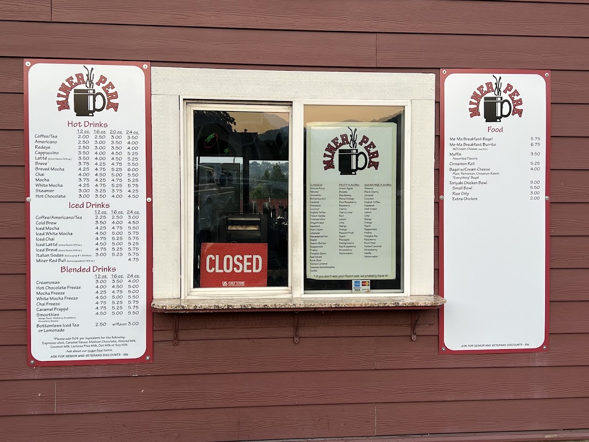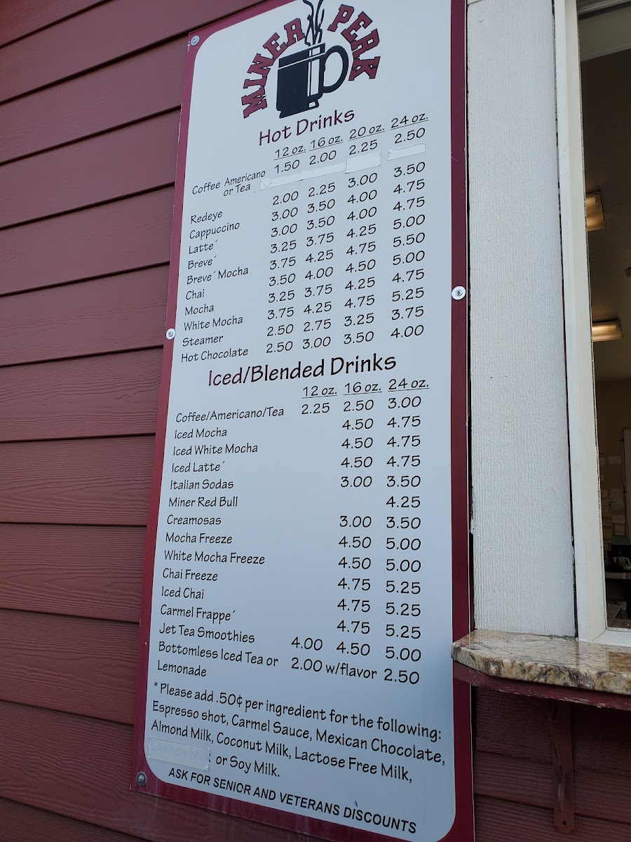 As a final takeaway after exploring the menu at Miner Perk, I’m left with the impression of a cozy, community-focused café that keeps things simple while offering enough variety to satisfy different cravings. The drink selection is especially well-rounded: refreshing Iced Chai, smooth Americano, indulgent Iced White Mocha, playful Italian Sodas, and the energizing Miner Red Bull make the iced lineup appealing, while hot classics like Coffee, Chai, Hot Chocolate, Cappuccino, and Steamer deliver familiar comfort. For those who enjoy richer textures, blended options such as White Mocha Freeze, Caramel Frappé, and Chai Freeze stand out, alongside lighter, refreshing choices like Creamosas and Iced Tea Or Lemonade. The food menu complements the drinks well, leaning into hearty, no-frills café fare with items like the Me-Ma Breakfast Bagel, Bagel With Cream Cheese, and Muffin, all ideal for a quick bite, while the more filling Me-Ma Breakfast Burrito adds substance for a fuller meal. Even simple options like Rice Only reflect a menu designed for everyday comfort rather than complexity. Overall, Miner Perk’s menu doesn’t try to overwhelm; instead, it focuses on familiar flavors, reliable choices, and a balance between drinks and food that makes it an easy, welcoming stop for both locals and travelers passing through Yreka.
